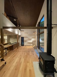 薪ストーブを設置し、輻射熱によるやわらかな暖かさが空間全体に広がります。