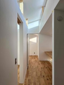 室内へ一歩入ると、吹抜けのリビングを中心に